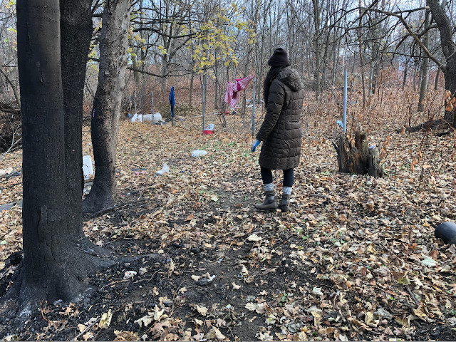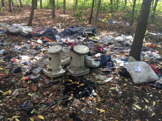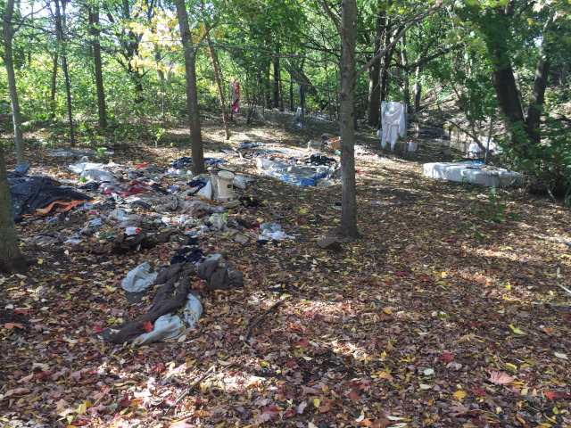 Upon finding no camping activity, volunteers cleaned up the trash, brought the clothes to be dry-cleaned, and donated the clothes to charity.
