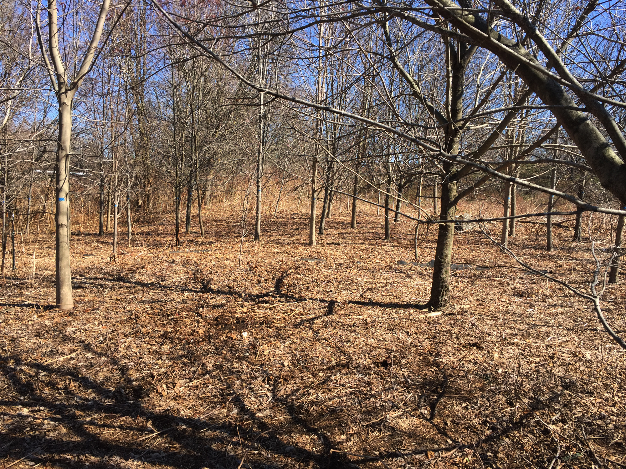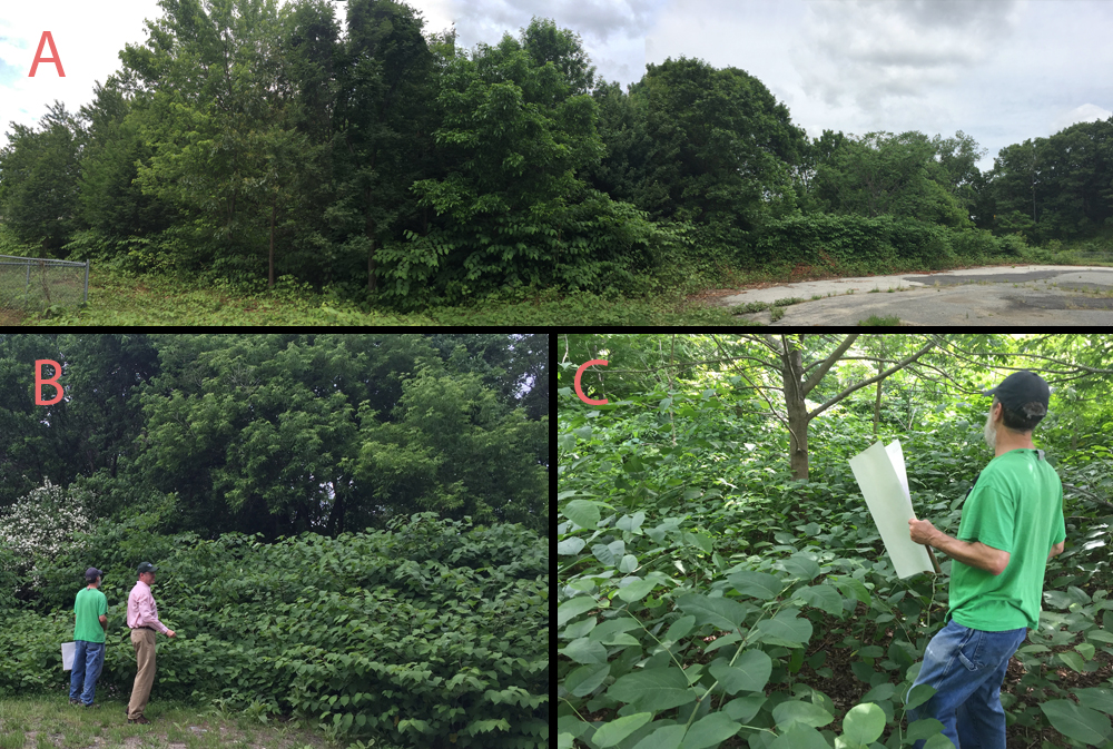 The first trees we planted are effective at shading out knotweed as seen by this evidence below. Image A is a photo of the whole Collyer Field tree planting area on June 8, 2016. Image B shows the knotweed exposed to full sunlight is taller than Greg and Douglas (who helps us identify trees and suggest forest health). Image B shows the knotweed among the first trees planted in 1999 and 2000. Greg is significantly taller than the knotweed reach.