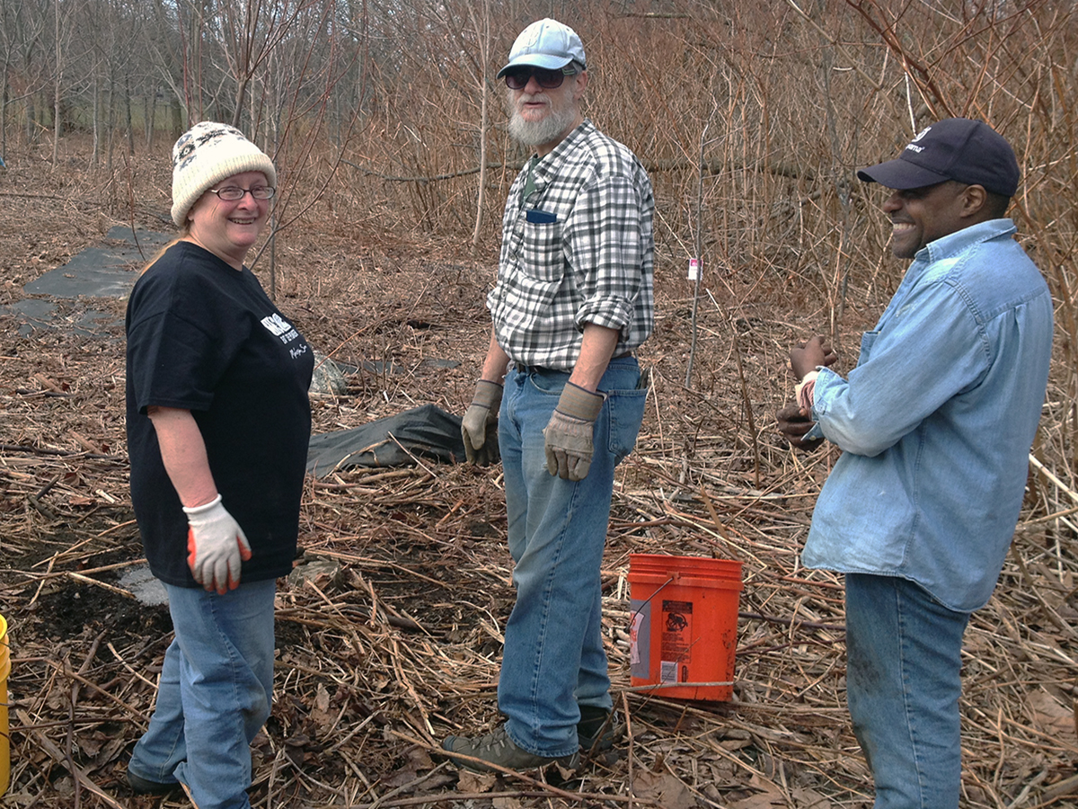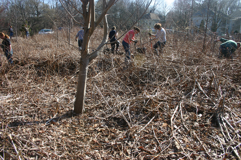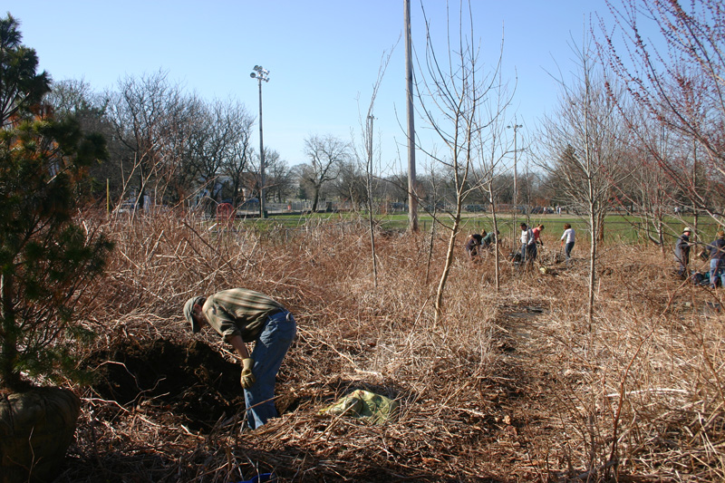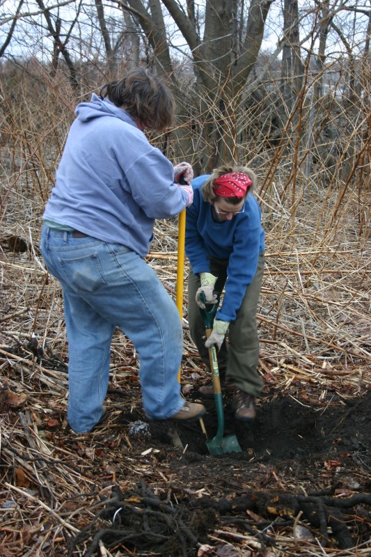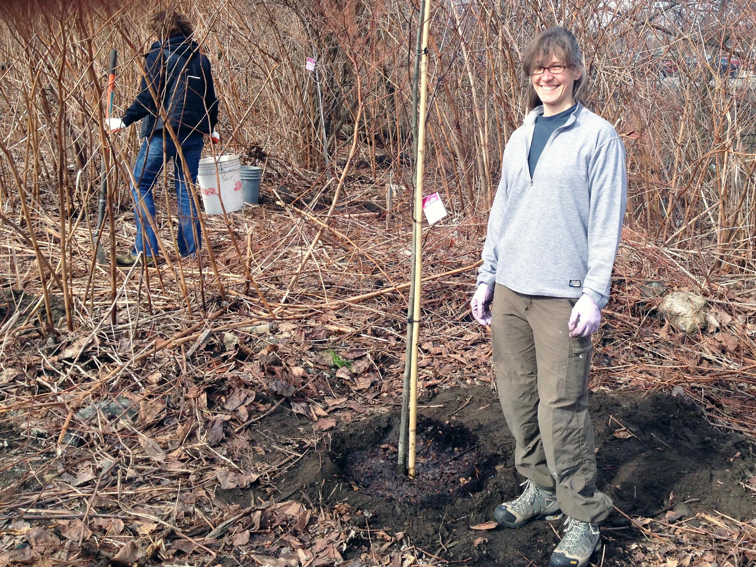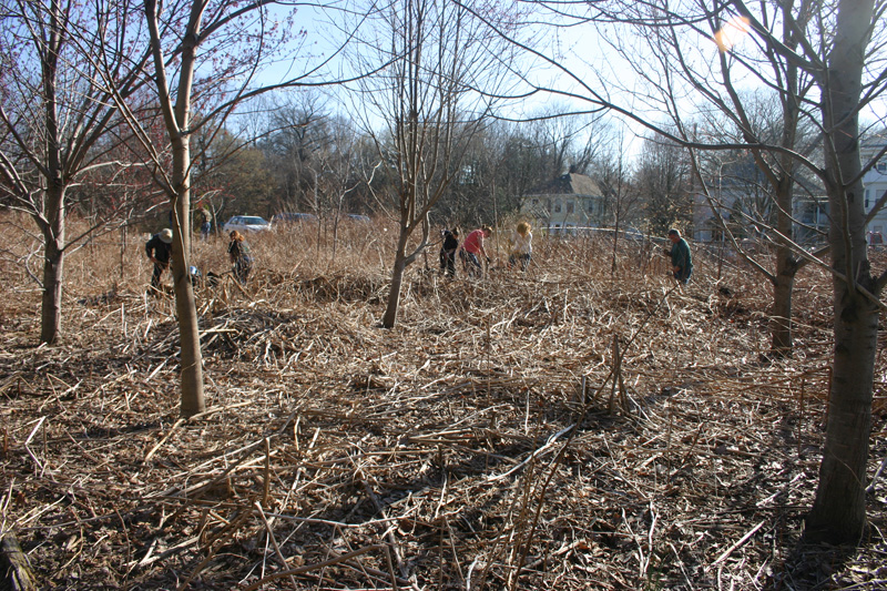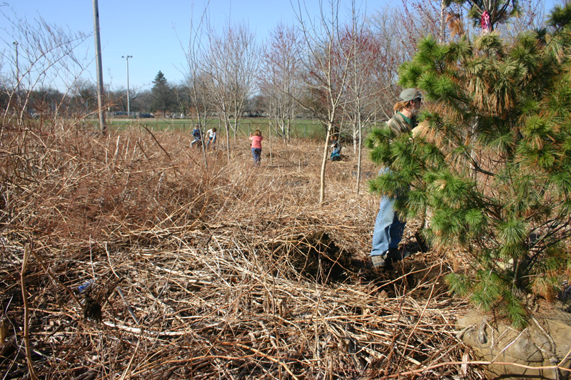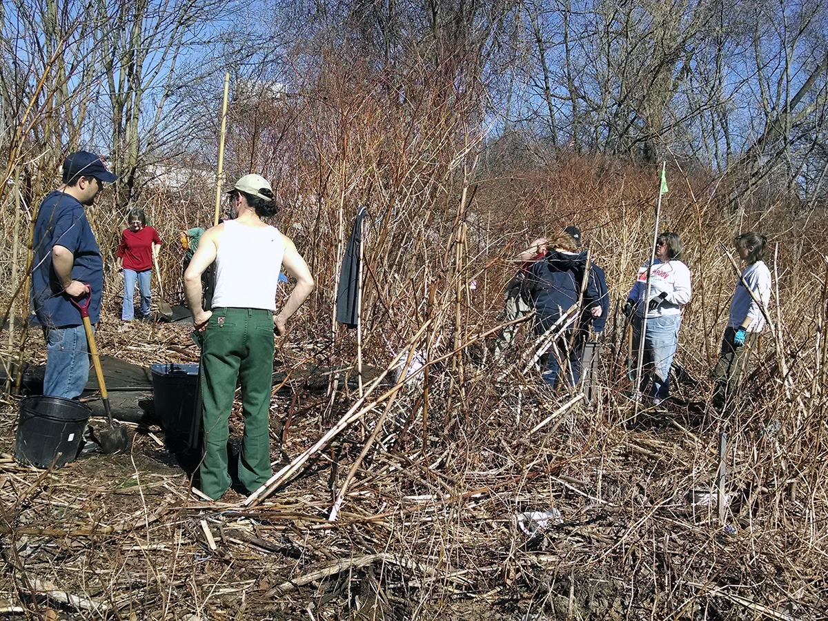 Pictures from the 2010 Tree PlantingFriends of The Moshassuck has been planting trees at Collyer Field in Providence for over 10 years. The site is a field of invasive alien Japanese knotweed, and our planting is an effort to eliminate the invasive alien weed by growing big and tall trees to shade it out. Preliminary results suggest that the effort is starting to bear fruit, and under the earliest plantings (and biggest trees) the knotweed is showing the effects of shading. We believe this is a community-friendly, totally non-toxic, way to deal with one of the most invasive plants in Southern New England and would be happy to help any local organizations seeking to restore areas damaged by knotweed.