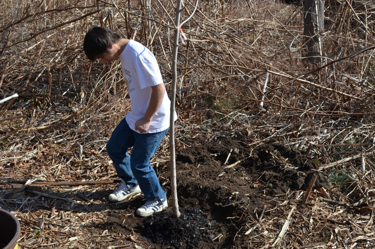 Pictures from the 2014 Tree PlantingThe weather was picture perfect for April 12th. An ideal gentle rain had fallen all night so the soil was moist and malleable.We start by preparing the earth for the six new tree additions for the year.