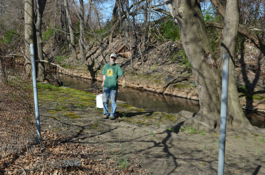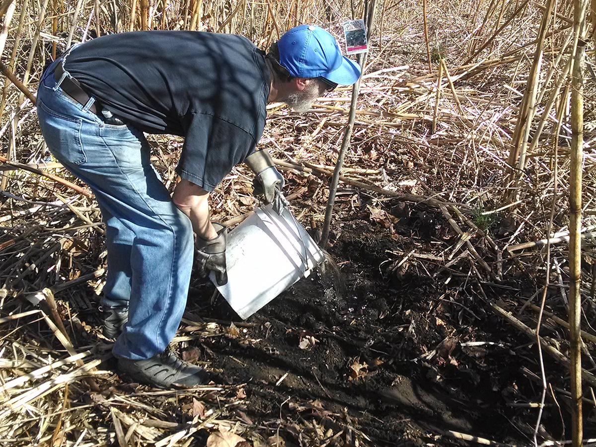 After planting, Greg waters the new trees from the ample source of the Moshassuck River nearby.
