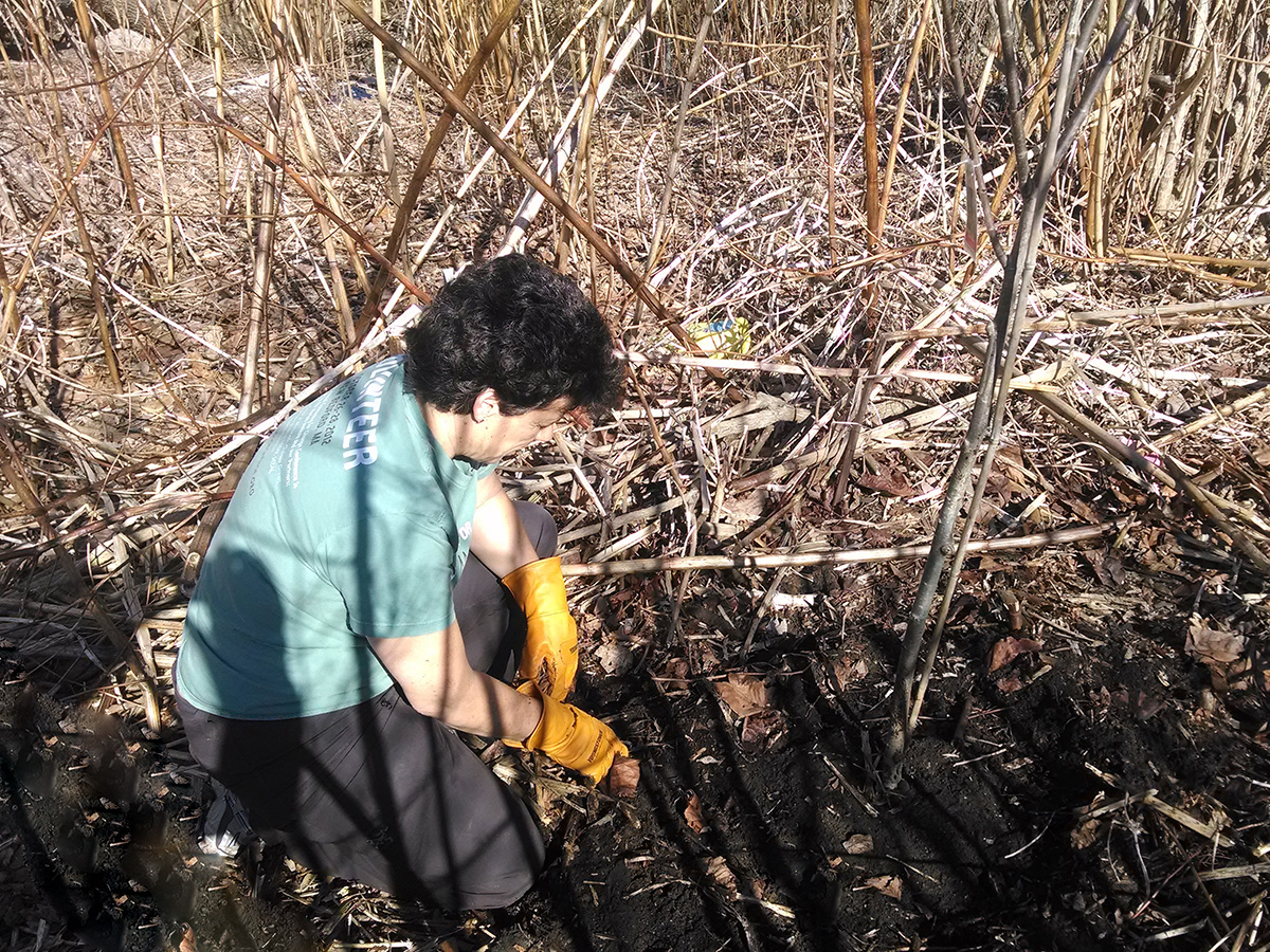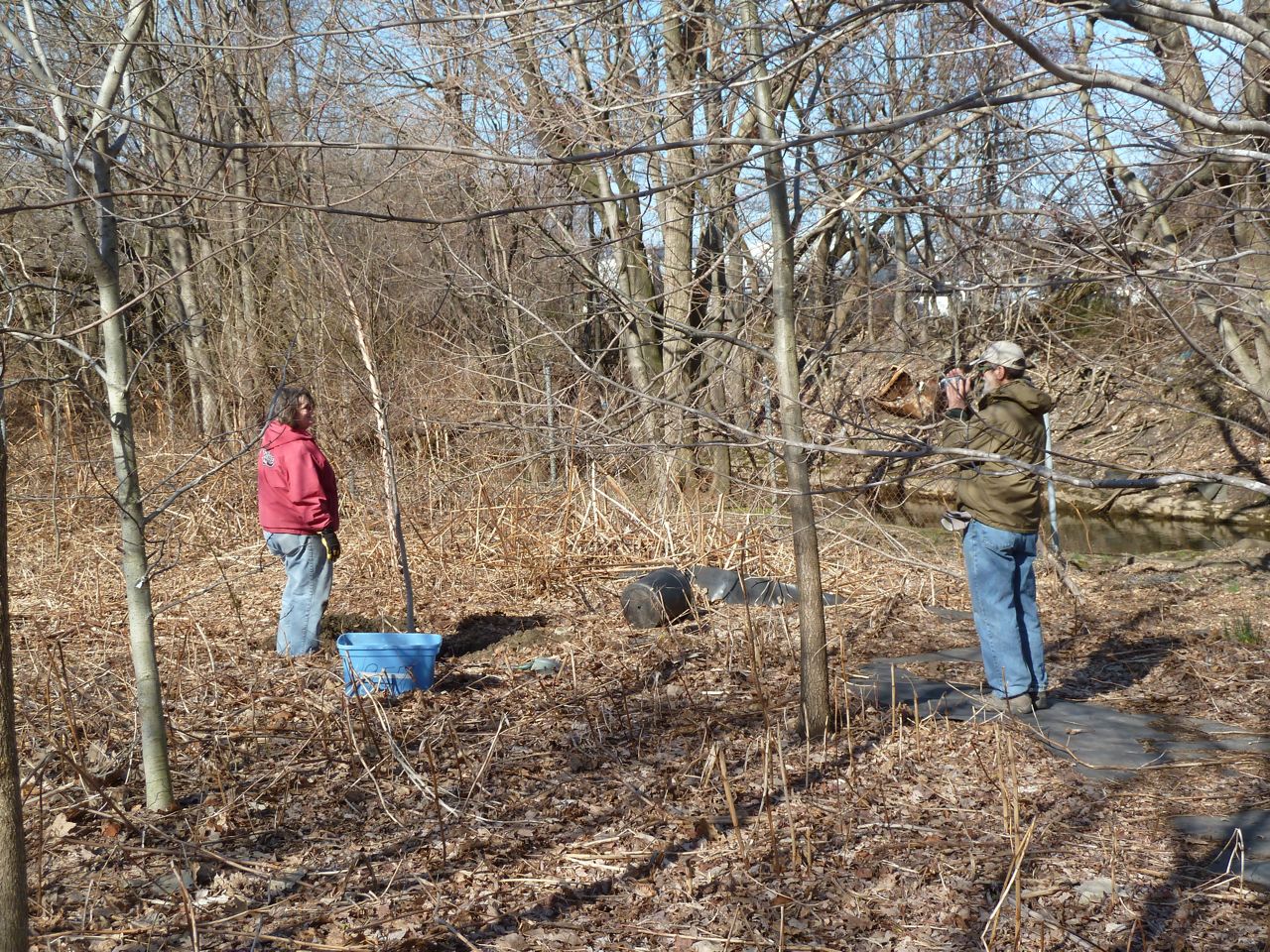 We water the trees with water from the Moshassuck River nearby, and then clean up the field for any obstacles that will prevent easy access to the trees during their first summer in a permanent home.